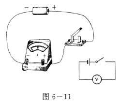(1)将电压表的正接线柱通过开关与干电池的正极相连,负接线柱与干电池的负极相连,合上开关,这时电压表的示数表示干电池的电压(图6-11)